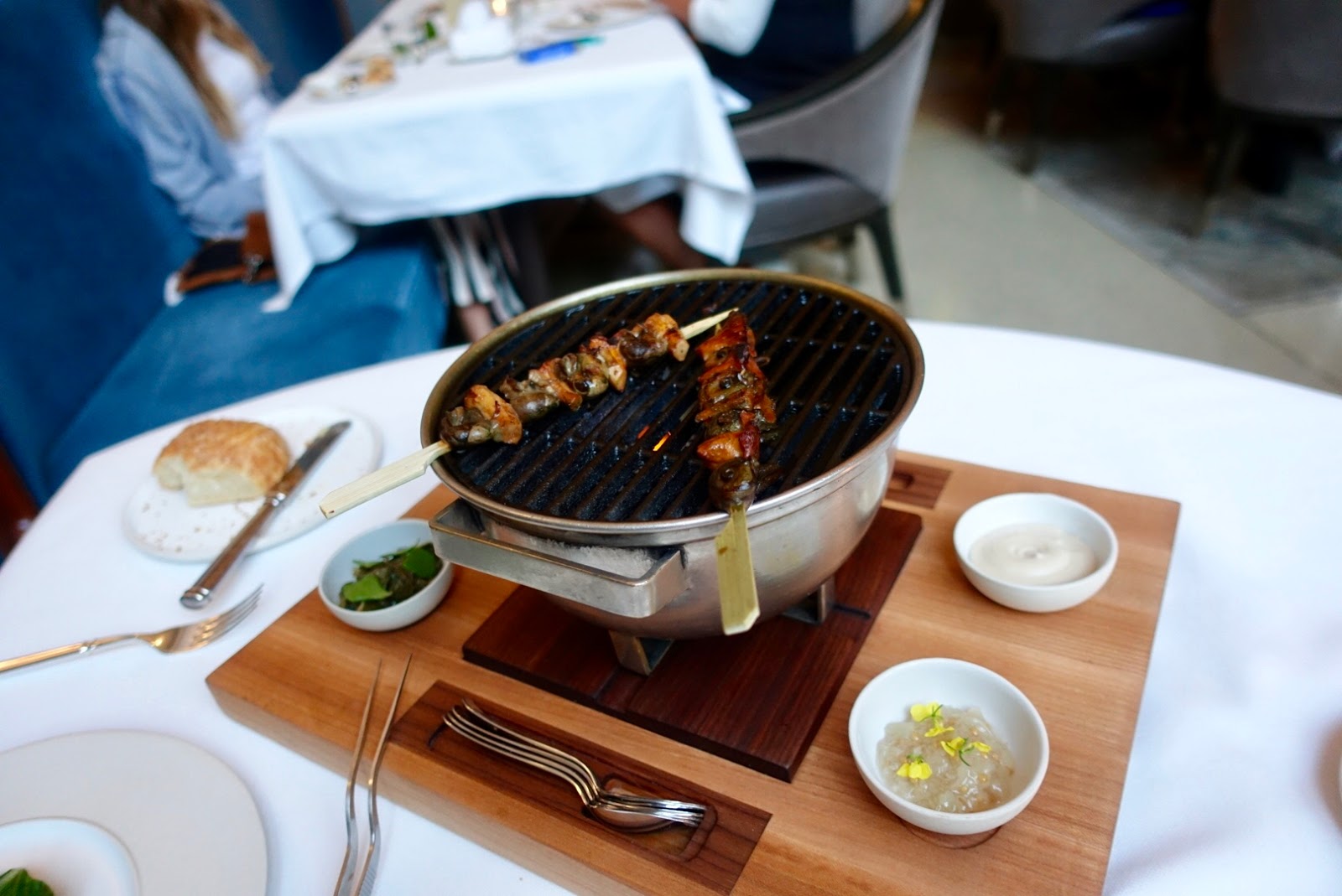 Next was a tabletop grilling, little grey snails – locally sourced and feeding on mint – and chanterelles on skewers got their finish tableside. This was fun to watch!