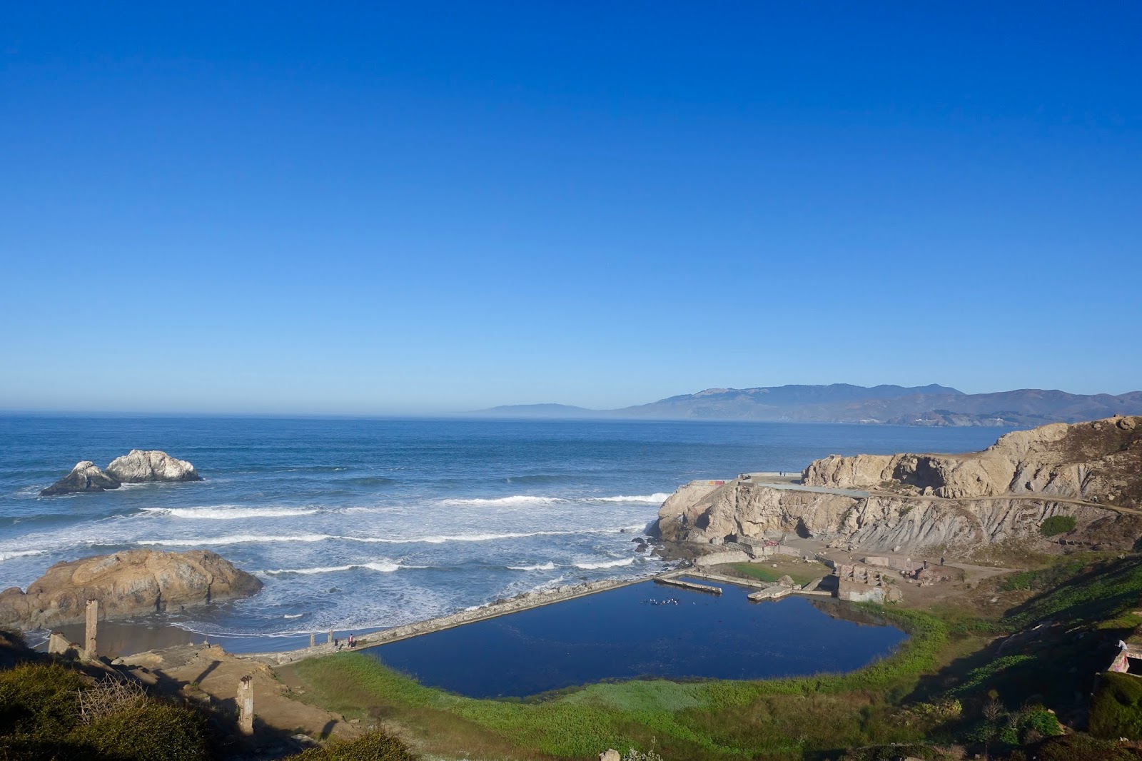 a former swimming pool complex that burned down in 1966 and is now in ruins. From here the Lands End Trail winds along the coastline. Every now and then, you get glimpses of the GGB. There is a path down to Lands End Point (3), which is a great spot to view the GGB.